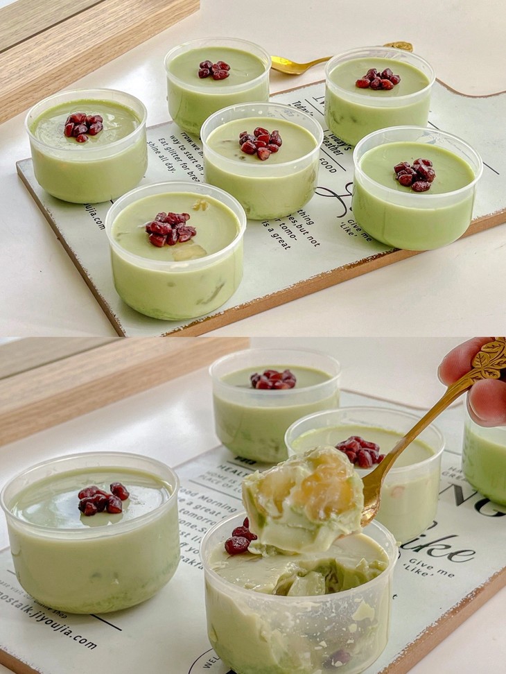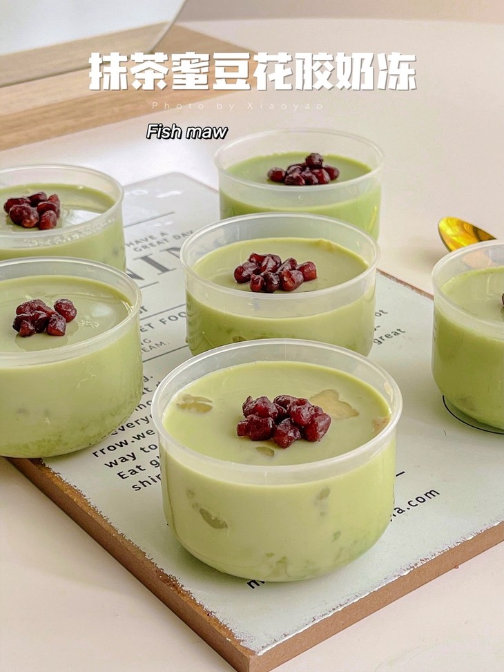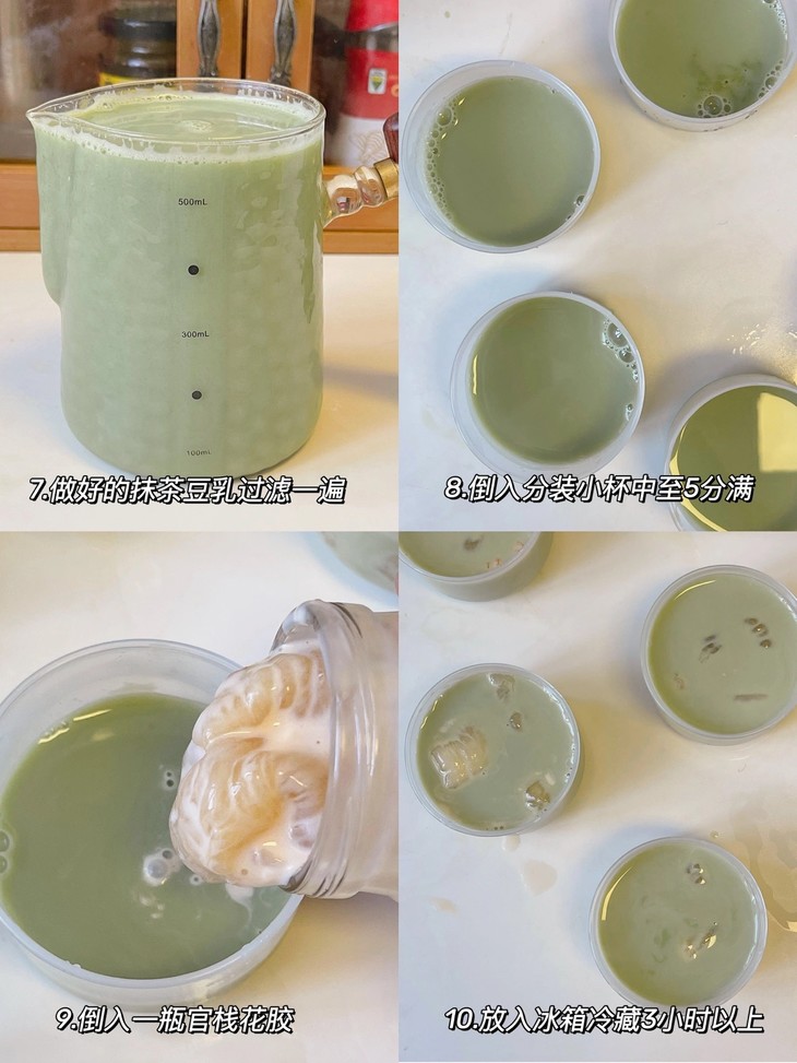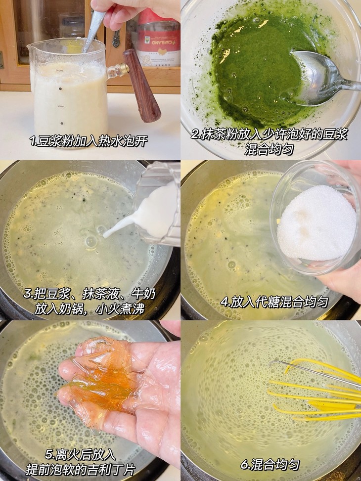 豆浆粉60克、水350克、牛奶100克、代糖30克、抹茶粉5克、吉利丁片3片、花胶4瓶,蜜豆适量