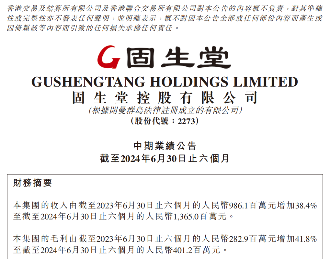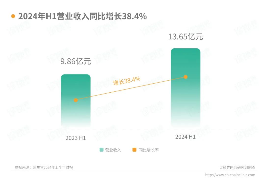 2024年8月20日晚,固生堂(2273.HK)公告,截至2024年6月30日止6个月中期业绩,集团的收入同比增加38.4%至人民币13.65亿元;经调整溢利净额同比增加45.3%至人民币1.48亿元。2024上半年的13亿达到了2021年全年营收的水平,增长速度较快。