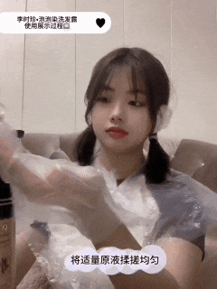 防护工具戴好之后,我们挤出染发剂,在手上轻轻揉搓一下,然后就像洗头一样,将揉出的泡泡均匀搓进头发上。