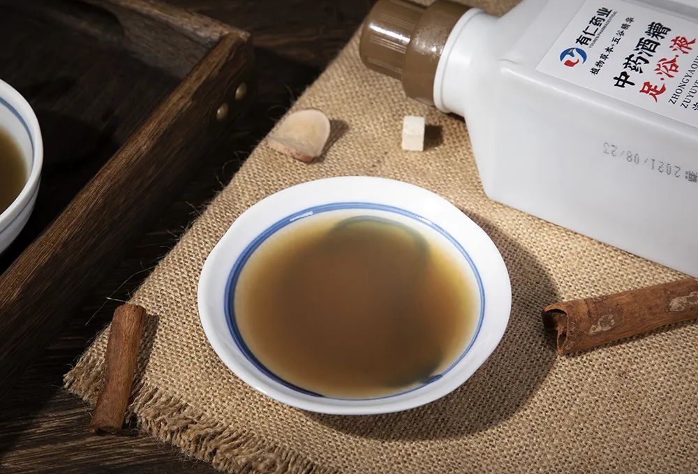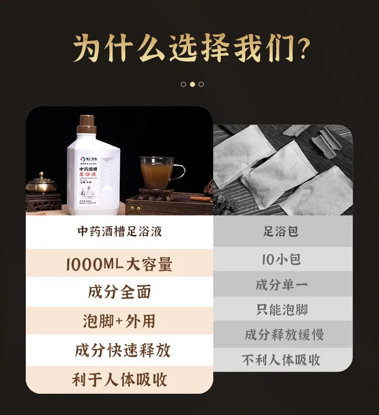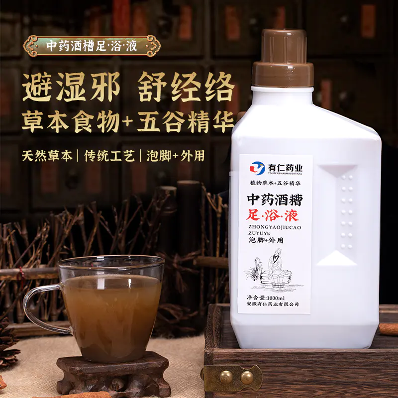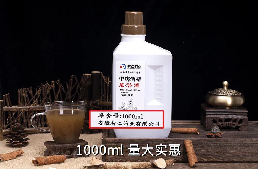 足浴液将23味药材和白酒浸出液,与白酒酒糟进行黄金配比,最终研发出了这款效果爆表的“有仁药业中药酒糟足浴液”。