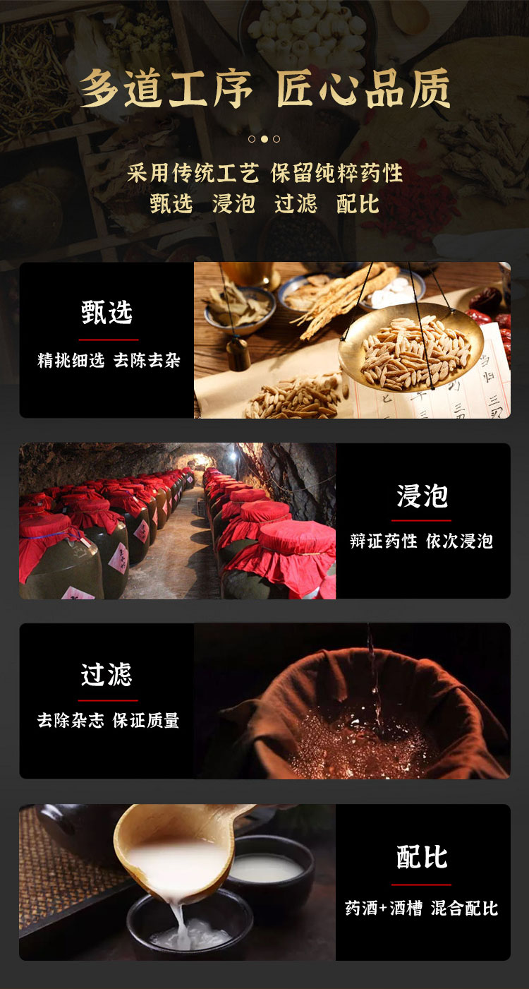 挑选,洗净,切片,加入米香型白酒,一起浸泡在陶坛中至少30天,让药材的营养精华,充分浸出。