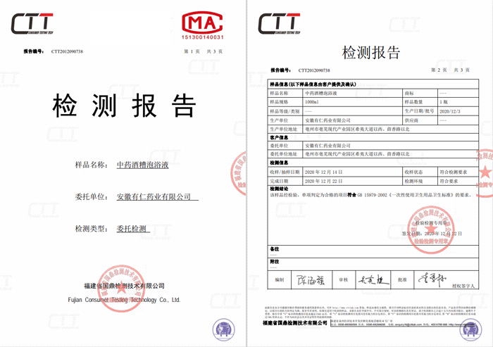 产品实力过硬,质量安全放心!这款中药酒糟足浴液就是典型,各项指标符合标准,成功拿下专业的检测报告。