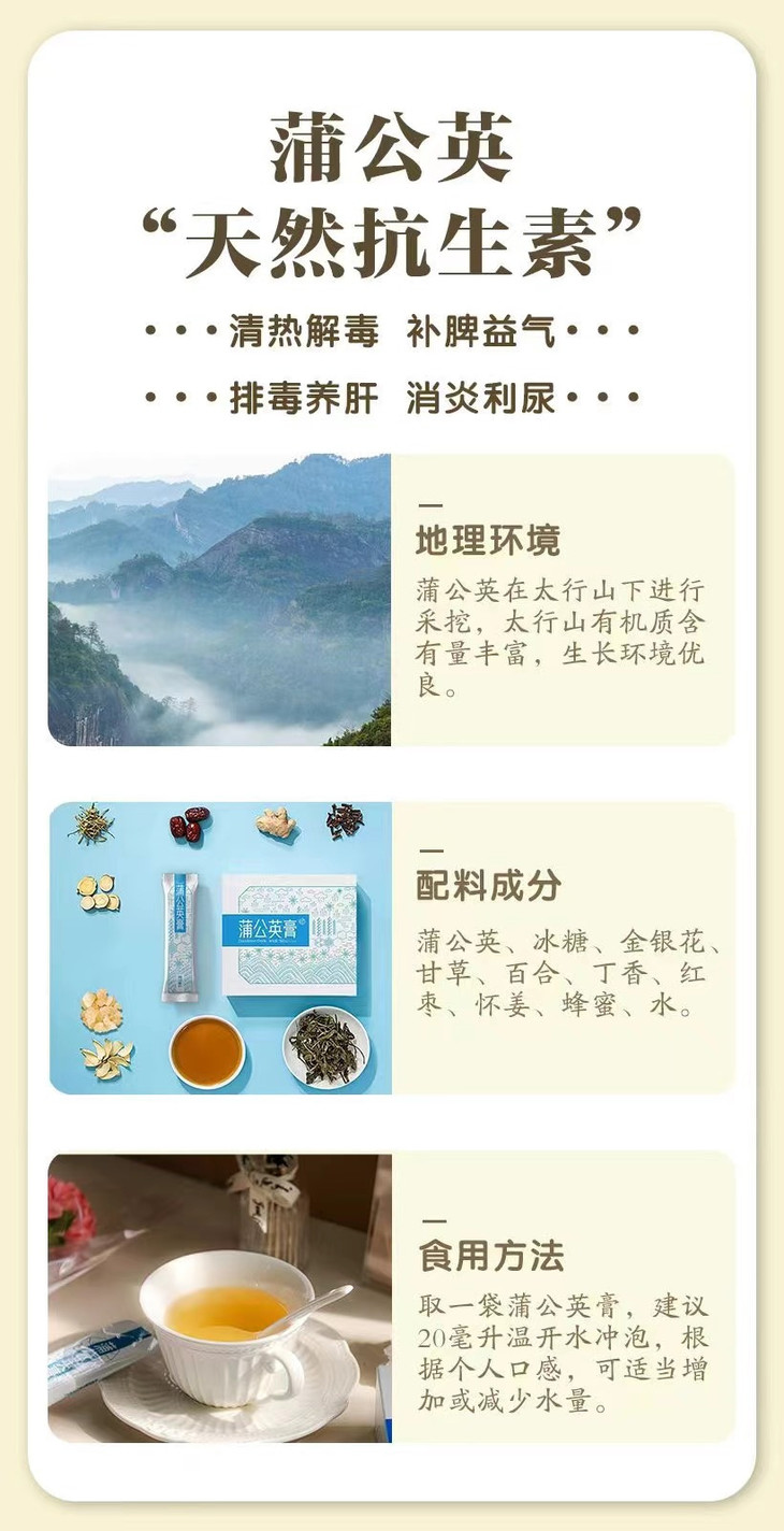古法工艺不加一滴水 它给你的健康不掺“水分”! ⭐️天然草本植物提炼熬制 0色素!0香精!0防腐剂!0增稠剂! ⭐️手工“文、武”火双火熬制 褪去蒲公英膏孤傲的清苦 转化成“浴火重生”的甘甜