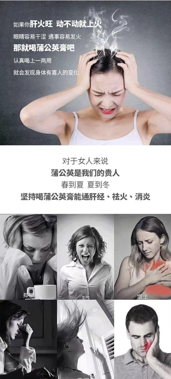 嘴巴异味,口苦口臭;视力下降,眼睛干涩;后背出油,头发油腻;容易发怒,脾气不好;脸色发黄,出现暗淡;无精打采,睡眠不稳...... 蒲公英是药食两用,味苦甘,性寒,入肝、胃二经,具有清热解毒、消痈散结的功效,膏方中加入怀姜、红枣配伍,中和了寒性,放心喝,不寒凉! 每日来两杯蒲公英膏,疏肝解郁~调节身体内部的平衡,时刻保持身心舒畅!