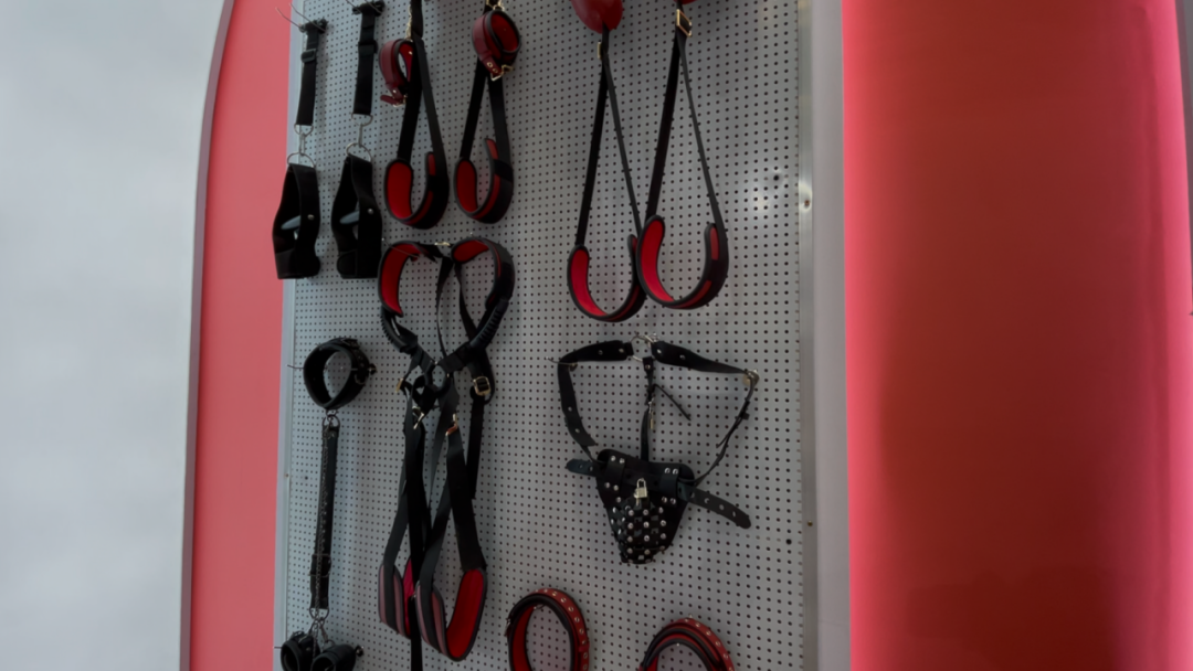 配件也是本次展会非常重要的一个部分。摆在展会入口处的就是展出各类拘束道具的厂家。这类道具和身体接触的一面都使用绒面,使用起来想必是很舒适的。