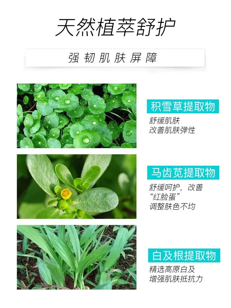复配敏感肌品牌必备成分—马齿苋和积雪草提取物,强化肌肤屏障,舒缓敏感性肌肤,改善肌肤弹性。