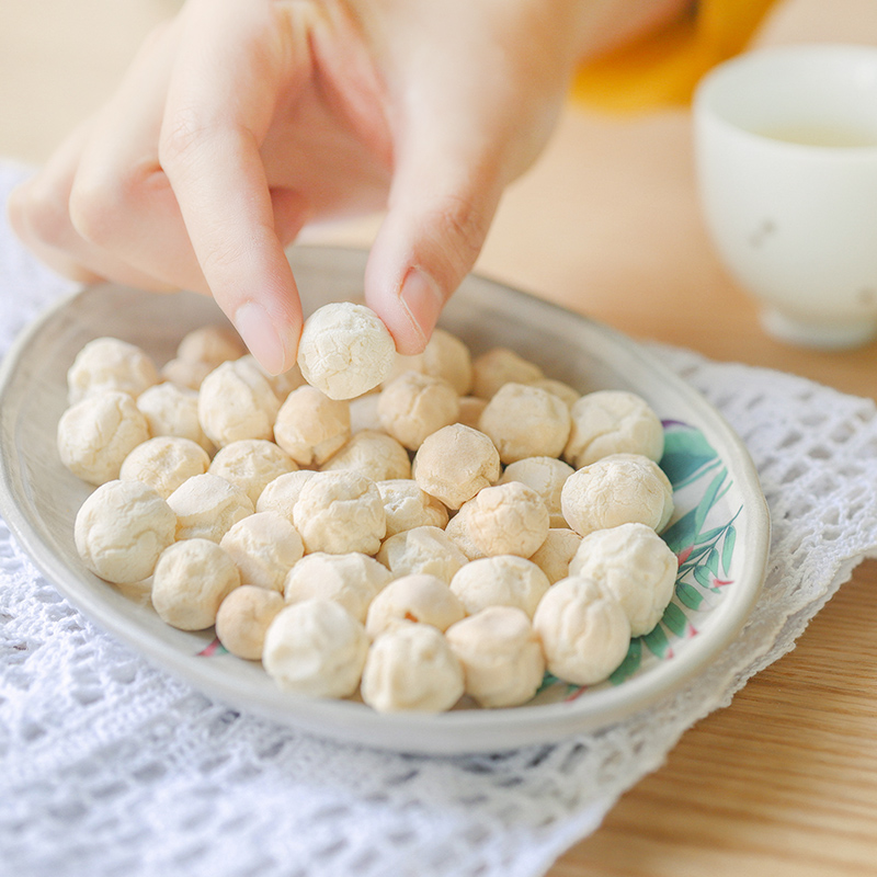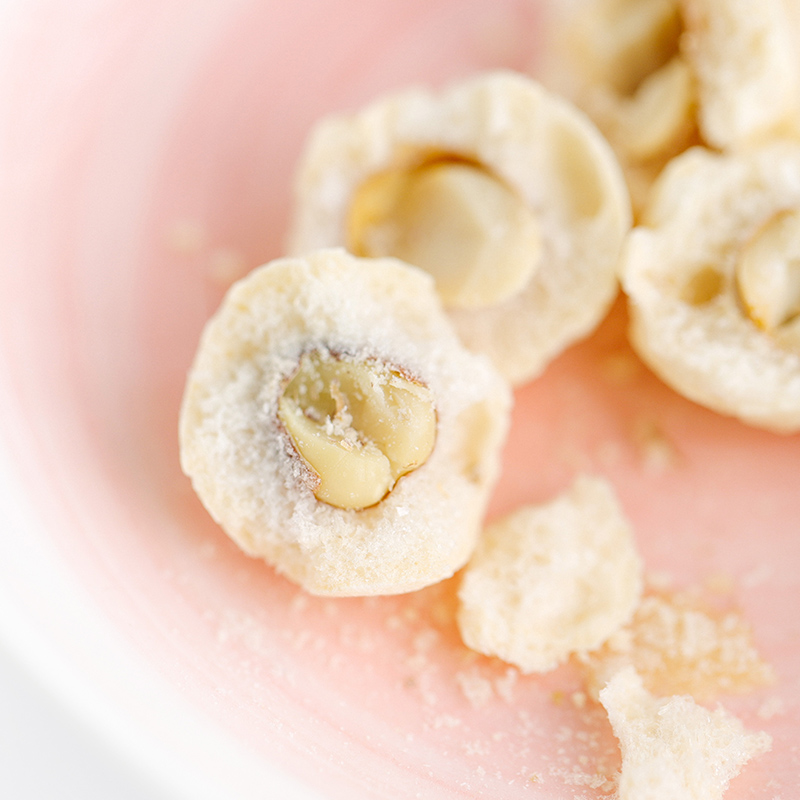 春日花生跟传统的鱼皮花生相比,没有那么硬,反而更脆,这种工艺很难得,我们的合作伙伴从日本春日井工厂请了田中师傅来帮助研发,外层酥皮用三天时间来裹,最终的口感十分酥脆。
