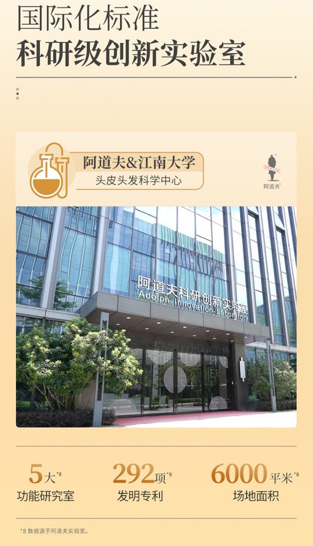 2019年,阿道夫与江南大学合作,共创民族品牌。阿道夫拥有国际化标准的科研级创新实验室,设有五大功能研究室,并拥有292项发明专利。