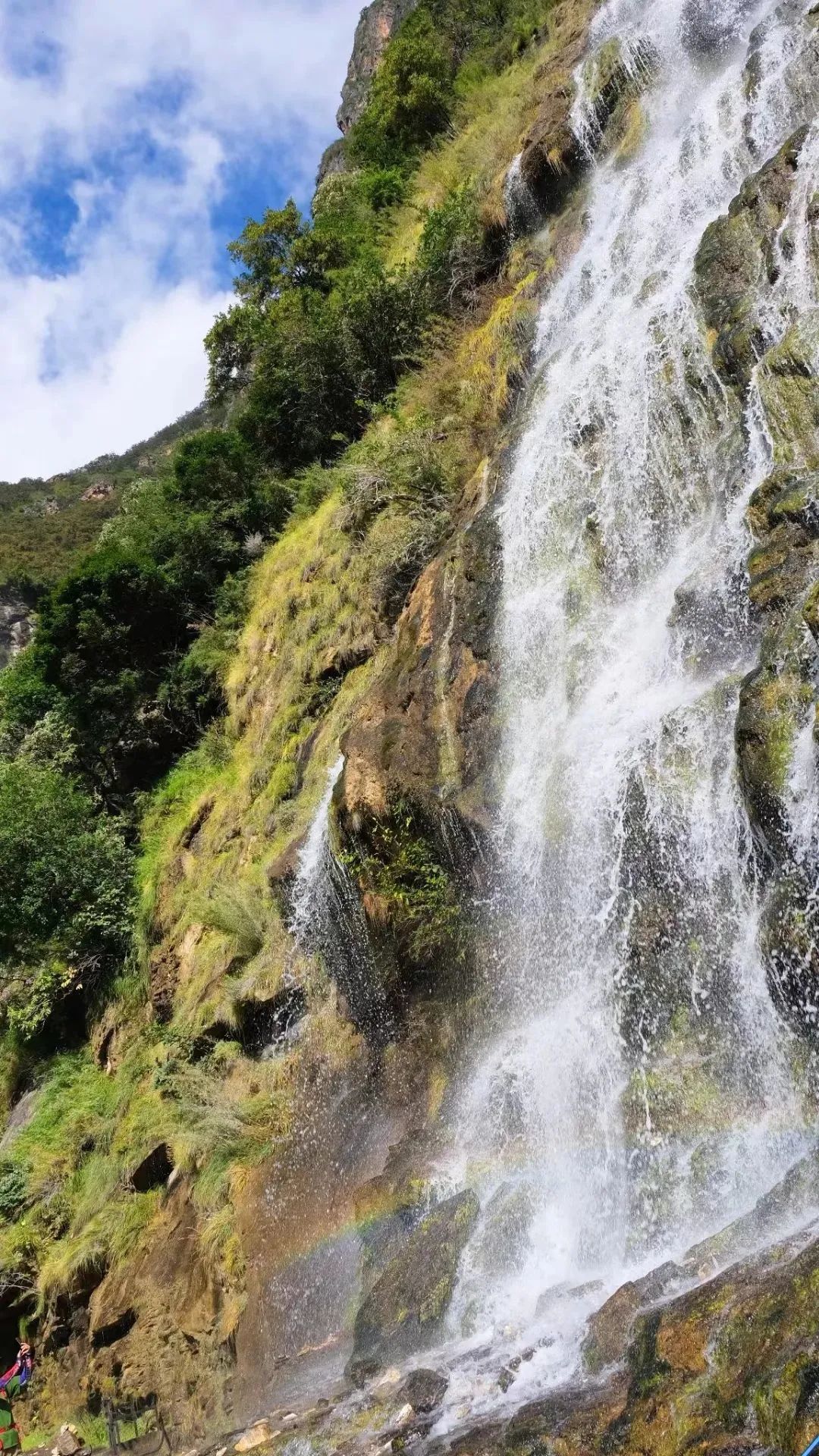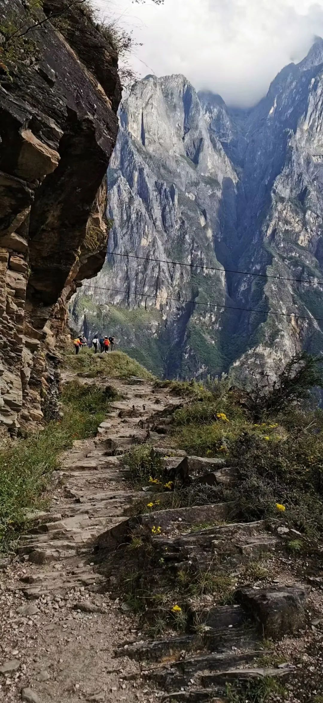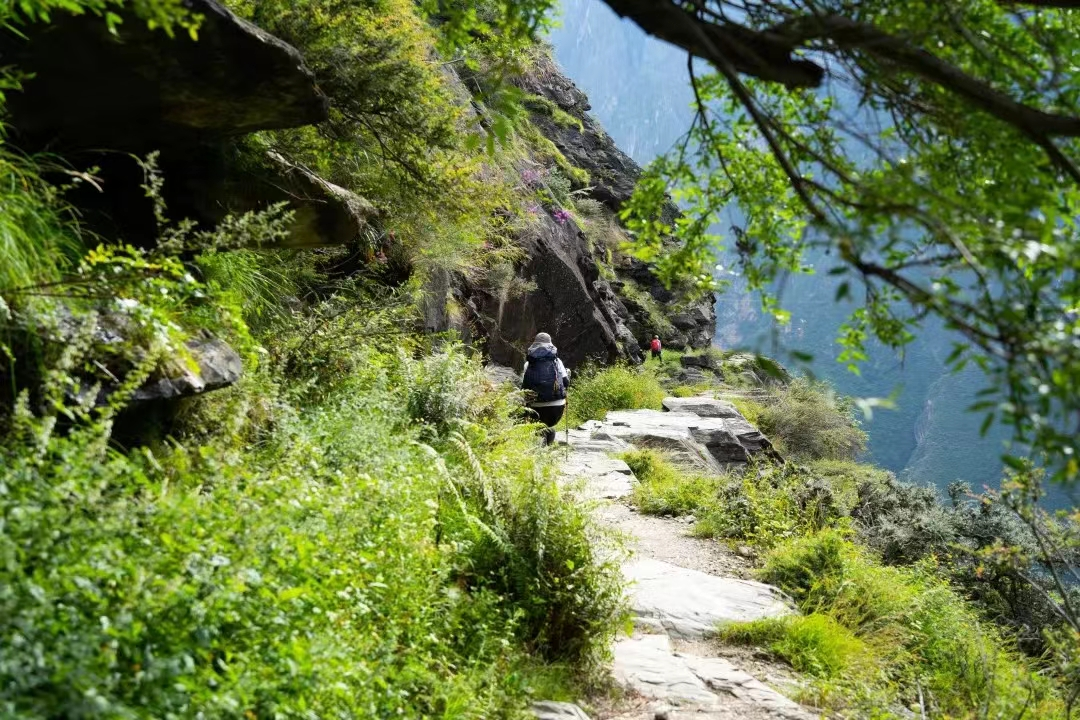 金沙江在此大拐弯,分隔玉龙雪山和哈巴雪山的同时,也劈开一道垂直高差近 4000 米的极深峡谷。滚滚而来的江水在这变得更加急涌奔腾。上世纪 90 年代被开辟为景区,如今因“世界十大经典徒步线路之一”的虎跳峡高路徒步线而闻名。遗憾的是,这条经典线路从纳西雅阁到中虎跳,全程也就 20 余公里。徒步完成快则一天,慢则一天半,就这,凭什么值得人从世界各地千里迢迢来一趟?好在这次借由哈巴的机会,没有错过它。以纳西雅阁为始,一出发便是弯弯曲曲攀升的石阶路,这是传说中的“28道拐”,在这没有高反困扰,松林茂盛温度适宜。爬升至最高点(一块写着“山顶”字样的石头),俯瞰虎跳峡,江水由平静转为咆哮模样;仰视对岸,玉龙十三峰山体陡峭嶙峋,仿若散发出冷硬银光的披甲战士!随后便是横切着悬崖上的挂壁小路平缓前进,一路都有各种语言的指路标识或涂鸦。那是像书页般一层一层的石阶路面!怎么会有这么巧夺天工的自然造化呢?“读万卷书、行万里路”,是不是古人在这样的路上有感而发?我也当真是走在千百年前赶马人的驼铃声和茶香味里吧!