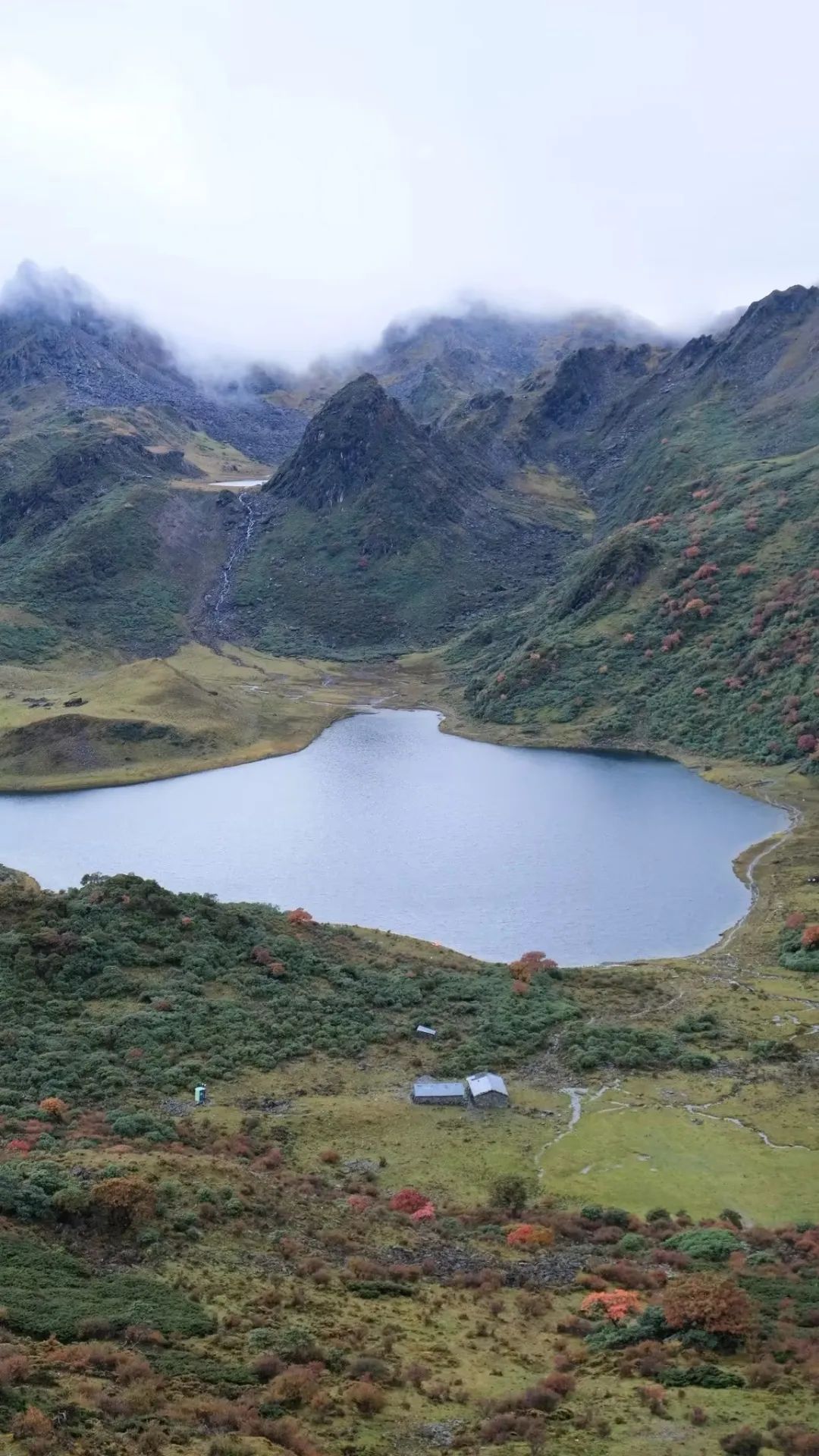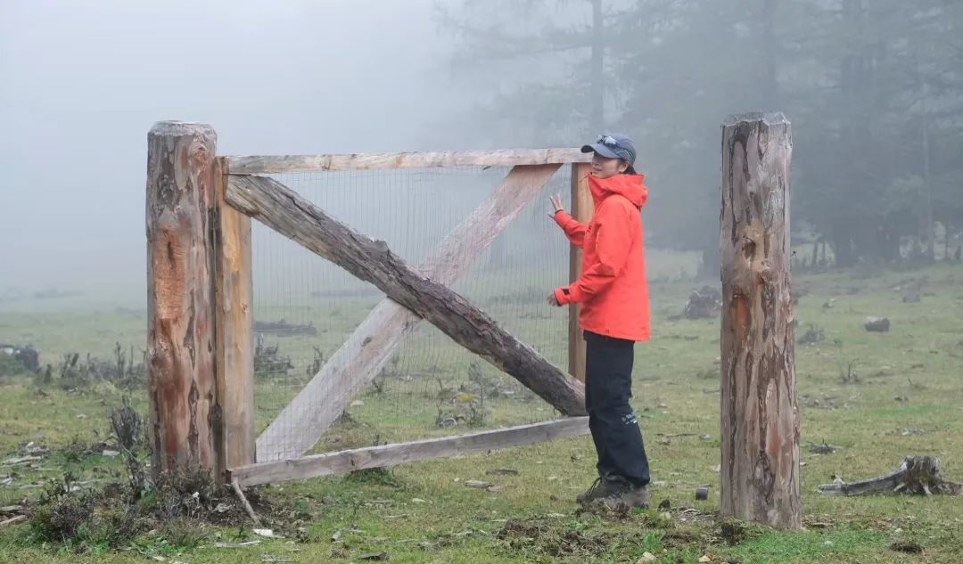 如果天气晴好,躺在帐篷里便能看到哈巴庞大雪白的山体,前景是秋色绚烂的杉树林,金黄直接蔓延至脚边。可惜我们经过时(还在这里的小木屋吃了热腾腾的面片汤,舒服),大雾弥漫,难得在天气转凉的 10 月,感受了雾索山林的夏日清爽,也不亏。再徒步约 2 小时到达一处高地,往下看,暗黑色的水被自然圈成一个边缘弯曲的湖,它是哈巴雪山区域面积最大的湖泊“黑海”。
