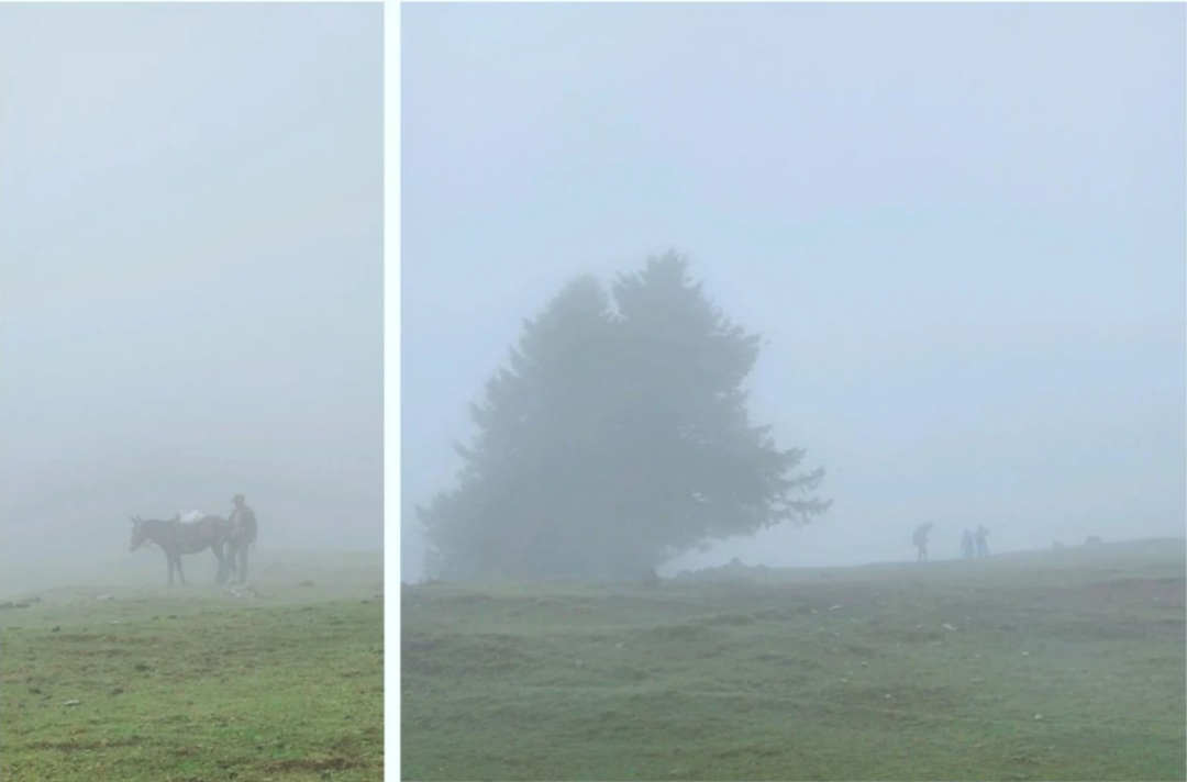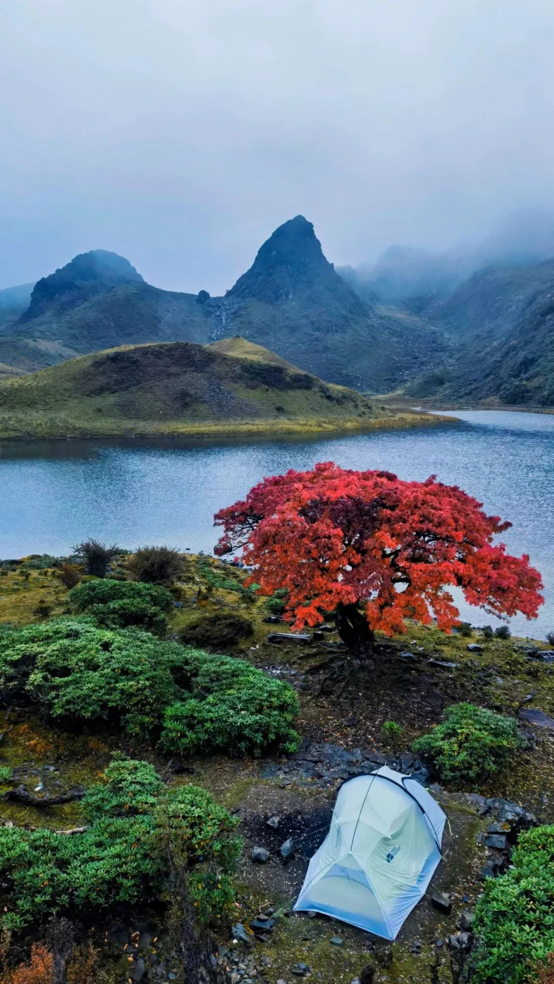 周围石山环绕,植被颜色深一笔浅一笔晕开,云层被风刮成水雾直往人脸上甩。天气冻人,来不及识别哈巴在哪个方位便匆匆往下,今晚的营地就在湖畔。仅它而已,在湖边低矮的杜鹃丛中拔地而起,为黑海蒙上一层网红滤镜。的确,黑海本岌岌无名,甚至连登过哈巴的人都不曾绕路来这里。但因为这棵树,秋风一扫,近年多少不登山的人也会跋涉而来,在树下待一待,见见它安静又热情的样子。