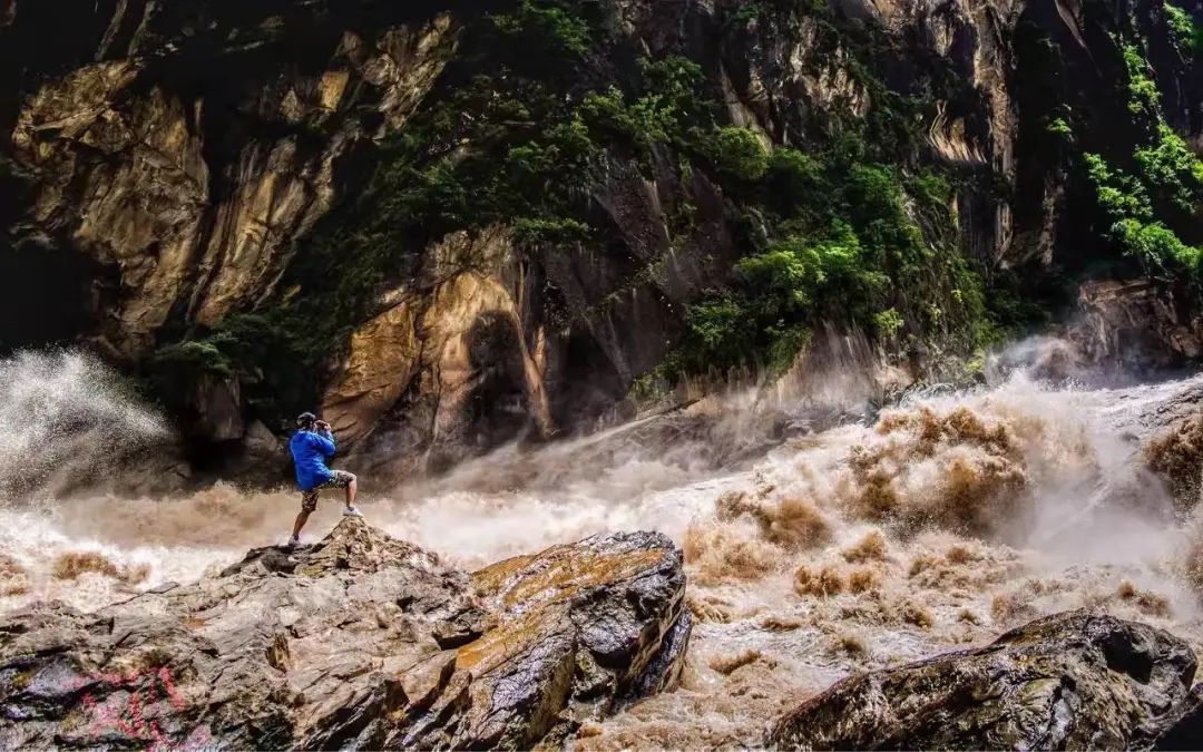 第二天晨起,继续徒步下至江边中虎跳。10 月份浑浊的江水在仅几十米宽的谷底冲撞咆哮,激荡的水花洒进我眼里,心悸,大河要吞了我。