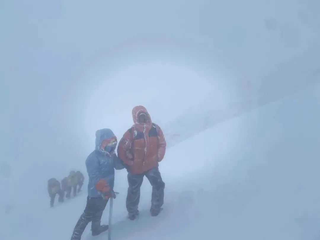 到雪线交界处(绝望坡下方平台)开始穿冰爪,再往上走。风更猛烈、天气更糟了,狂风裹着冰雪粒子往脸上扑。抬头,阴云黑压压盖着,一丝缝隙都无,还没踏上绝望坡,心先拔凉。