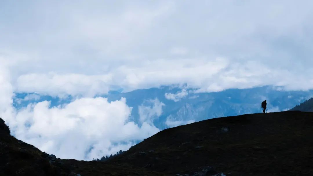 同时,五一未曾得见的山顶好风景又让我心有不甘耿耿于怀,不拍到好照片回去怎么写游记!来都来了,上!于是,兴致勃勃整装出发,从天黑走到天亮。六点多的时候,太阳在远处山际之上染红了小块天,这点颜色一下子冲淡了我的睡意,满怀希望加油爬,心想快上去看日出!10 分钟不到,眼前又是一片灰白迷雾,再转头,哪还有什么温暖的霞光,果然,4000 米以上的天气,比女人的脸还说变就变!