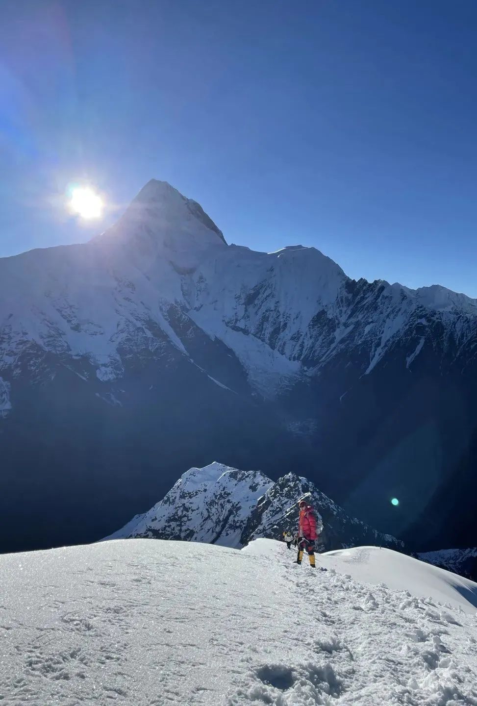 最后,总结前两年哈巴队员登顶率和天气变化规律,结论是:哪有什么百分百确定的准则,它可以在天亮前平静安稳,天亮后就妖风肆虐、浓云覆盖;也可以在前一天雨雪交加、冲顶困难,后一天就拨云见日、视野开阔、风景绝美。明明“受虐”的时候默念一万遍再也不来了,结果一年内就去了两次。大概还是心有不甘,想象在这座“金子之花朵” 5396 米的顶峰俯瞰,峡谷奔涌的气流越过重山,大地的纹理清晰可见,视野尽头的北方高耸起一排雪峰,那是亚丁三神山。