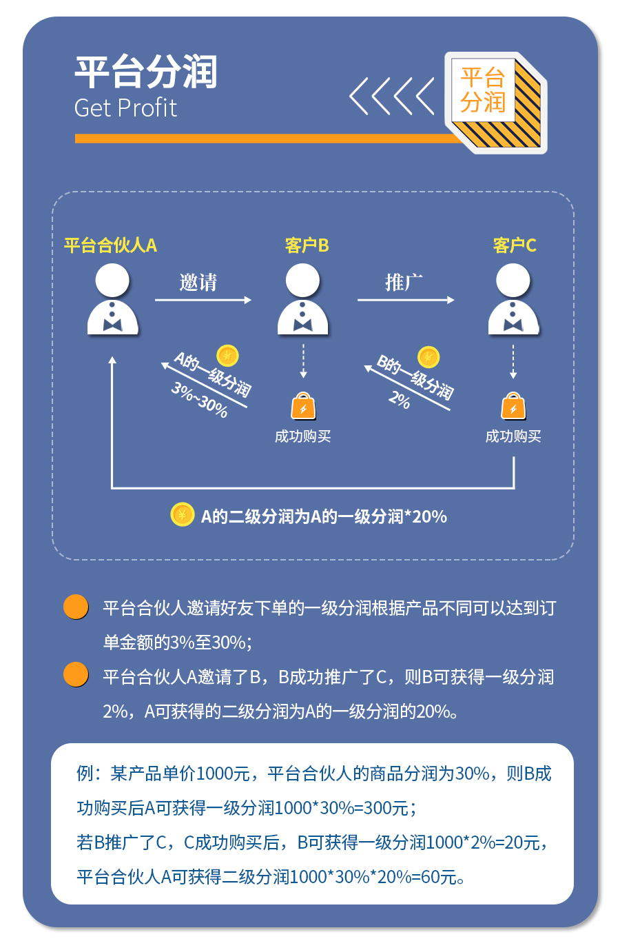 平台合伙人A邀请了客户B,B成功下单后,平台合伙人A可获得一级分润为产品价格的3%~30%;若B推广了C且成功购买,即B获得一级分润2%,平台合伙人A可获得二级分润(为A一级分润的20%)。