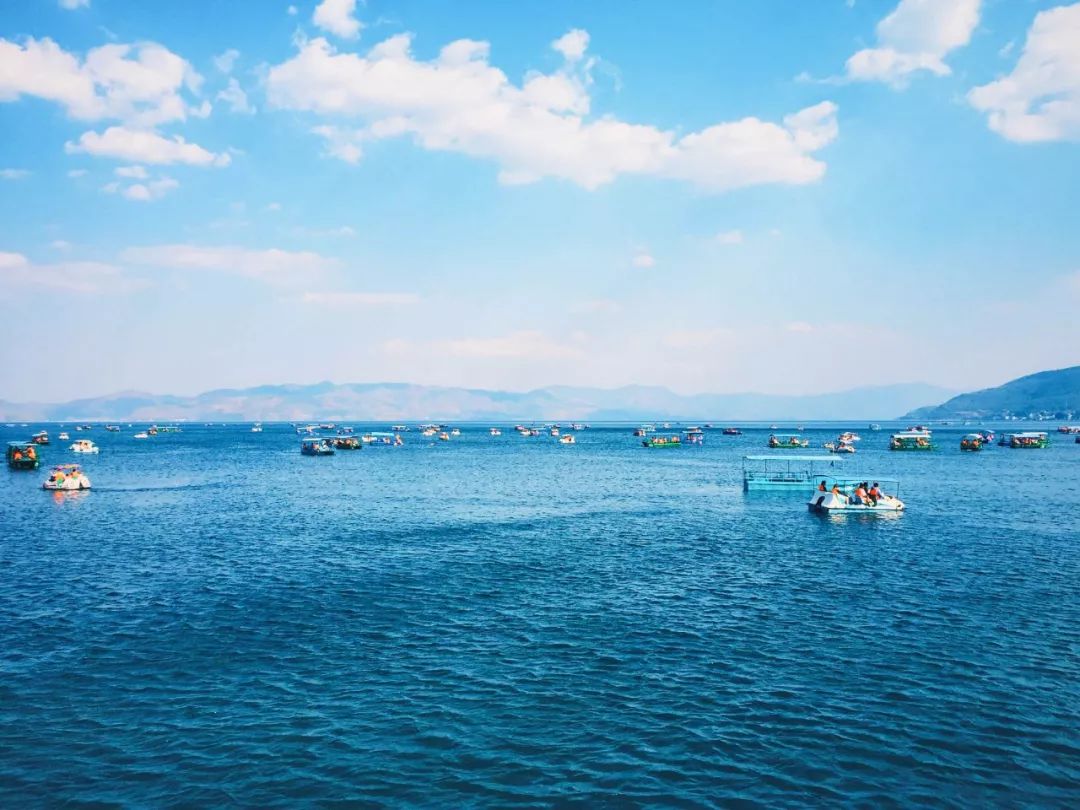 远处是影影绰绰的山,近处是轻轻盈盈的水,中间是星星点点的小岛,狭长的船只在湖面随风摇曳,有人将它称为“云南的马尔代夫”。