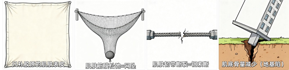 • 筋膜层 →是中间的“支撑网”,网松了,肉就掉下来了。