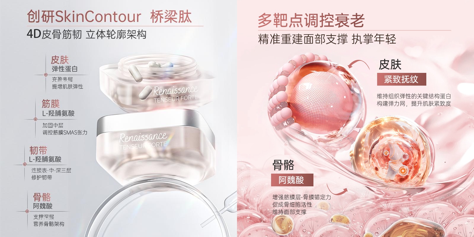 用独有的 【SkinContour™桥梁肽】 技术像给脸部搭建一个 “内置隐形提拉网” ,从筋膜→韧带→骨骼,三维加固,把下垂的组织重新“兜”回去!
