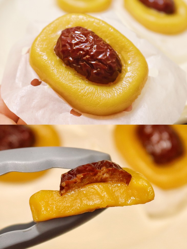 2、将糅好的面团分成12份,红枣去核对半切开, 略微压扁后按半个红枣。
