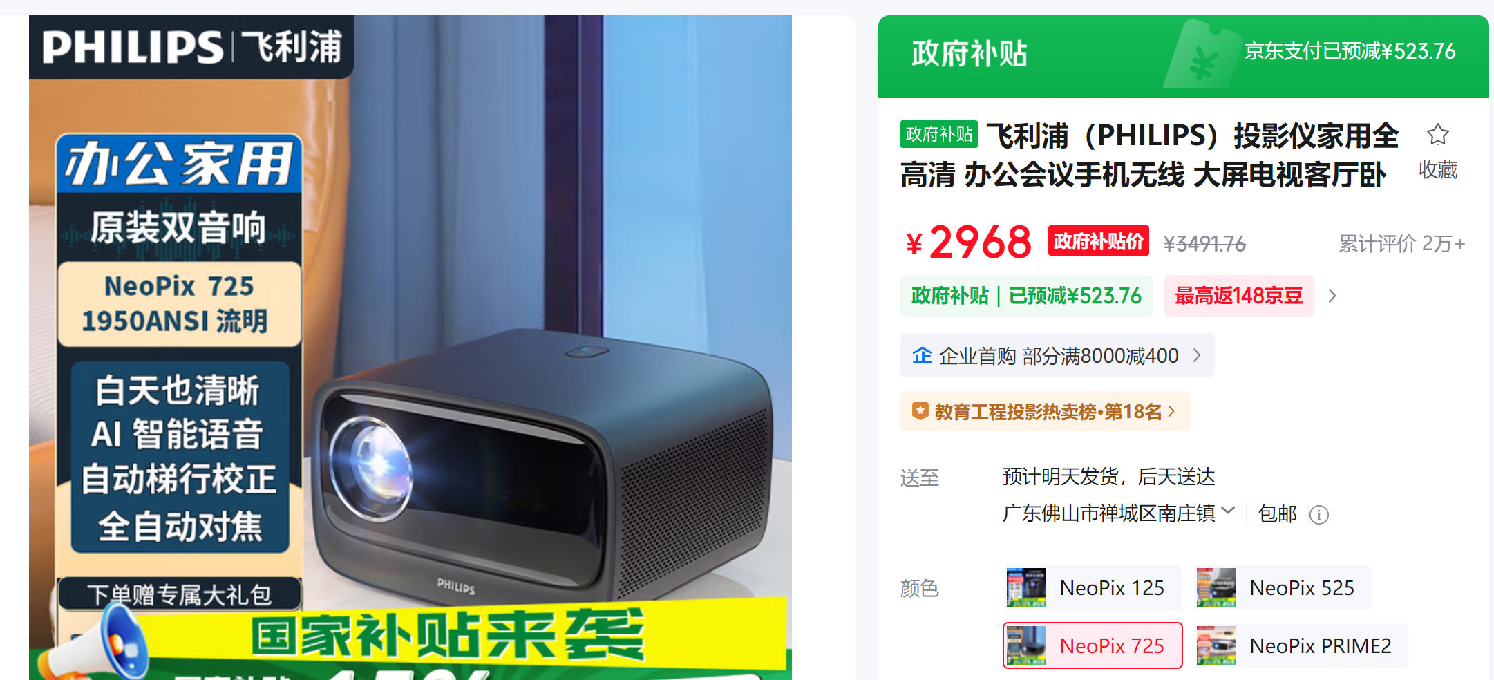 京东热销5万+的飞利浦NeoPix 725国补价