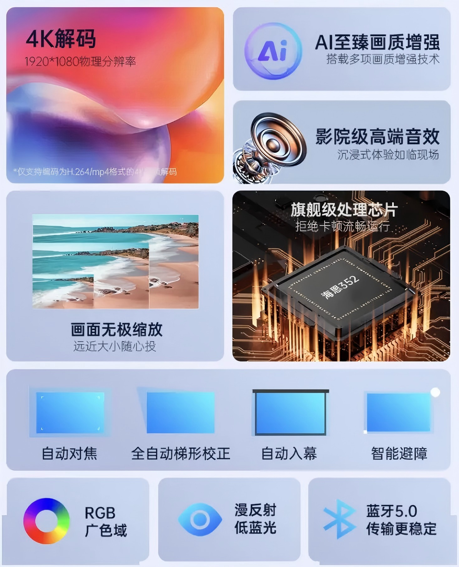 内置智能系统,支持无线投屏、语音控制等功能,可以将手机、平板等设备上的内容快速地投射到大屏幕上,提供了多个接口,包括HDMI、USB和AV等,以满足用户在不同场合的使用需求。