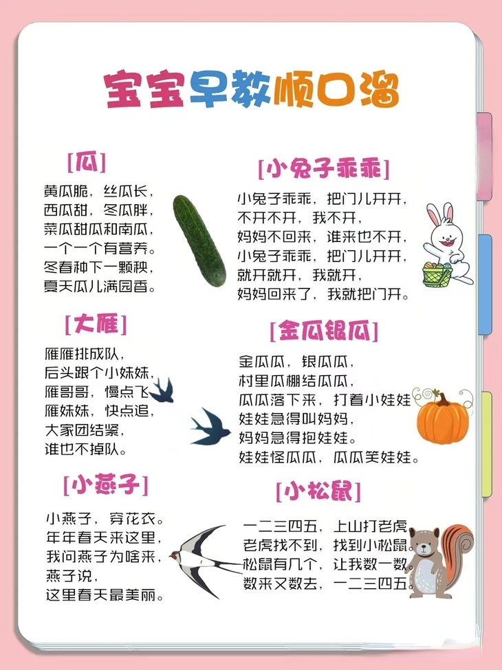 二是顺口溜朗朗上口,适合小月龄宝宝记忆诵读;