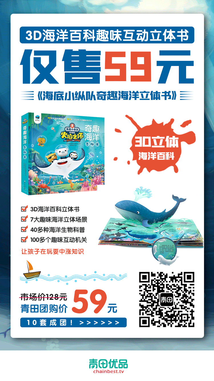 《海底小纵队奇趣海洋立体书》,设置7大海洋场景,有100多个知识点和立体机关,各种翻页、拉页小机关,满满的都是新知识!更惊喜的是,这套精装立体书原价128元,现在青田团购只要59元,立省69元!还是跟以前一样,就是这么划算!