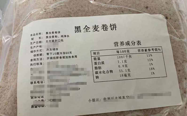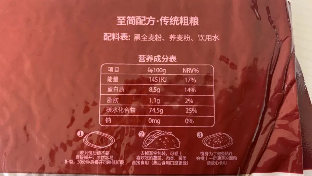 荞麦卷饼的配料很简单只有黑全麦粉、荞麦粉和必须的水,两种面粉各添加50%,配料很健康。