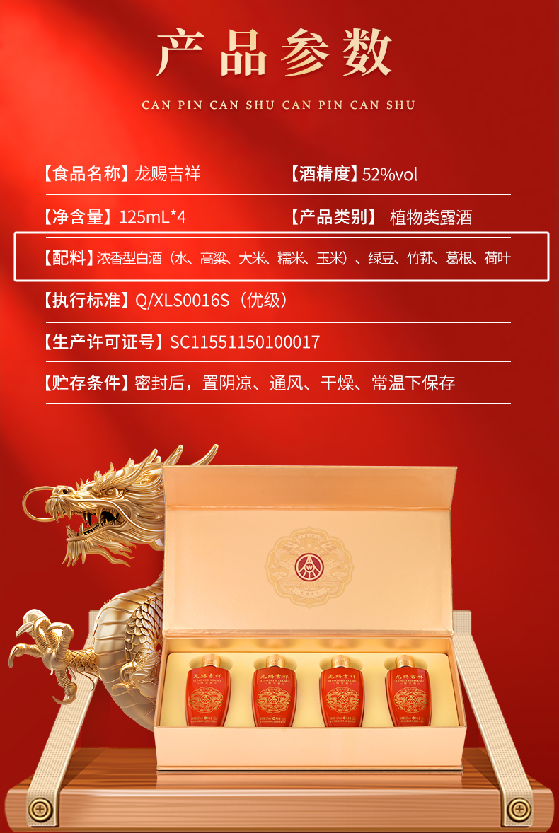 不同于口味单一的白酒,龙赐吉祥酒醇香口感,烈、甘、清、辣、香多味融合在一起,各味协调,每一滴都不负期待。
