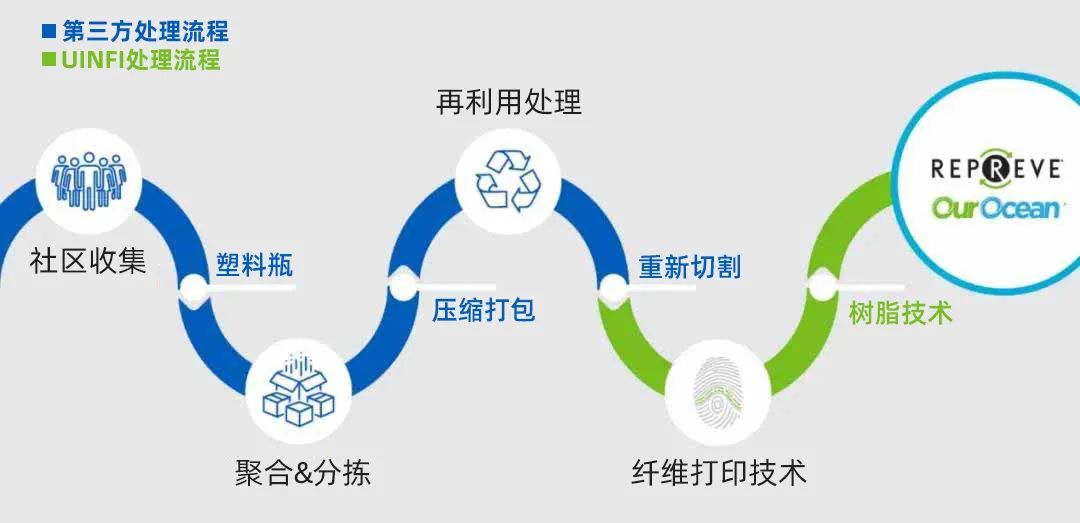 海洋纱REPREVE®Our Ocean™海洋纱的原料,是离海岸线50公里以内的陆地上收集的塑料瓶子,这些区域通常没有正规垃圾回收系统,而这些区域产生的塑料瓶子垃圾,有很高的风险最终会流入海洋。