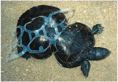 被塑料卡住的海龟,随着年龄的增长,身体已严重变形。(图源网络)