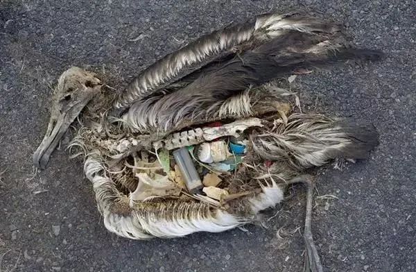 一只死去的信天翁,它的身体完全腐烂,肚子里全是打火机、各种塑料瓶盖等垃圾,触目惊心!(图源网络)