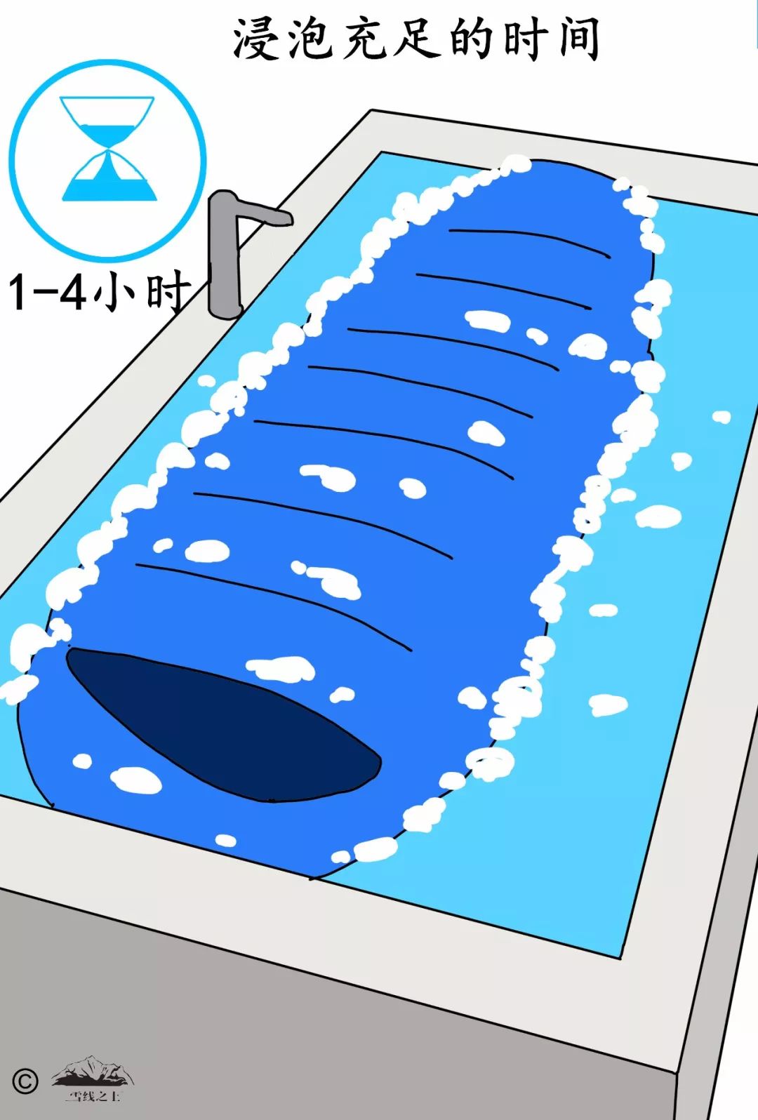因此不要急着擦洗那些藏污纳垢之处,先让睡袋静静地在水里泡一会儿,根据你睡袋脏的程度,浸泡时间时间为一到四个小时。