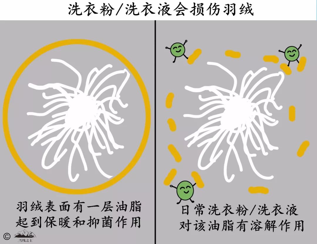 用日常家用洗衣产品会损伤羽绒,因为羽绒天然的保暖与抑菌能力得益自于其表面覆盖的油脂,而日常家用洗衣液(包括干洗加的溶剂)都对这层油脂具有溶解能力,从而让羽绒枝互相粘黏,降低了羽绒的保暖性能。