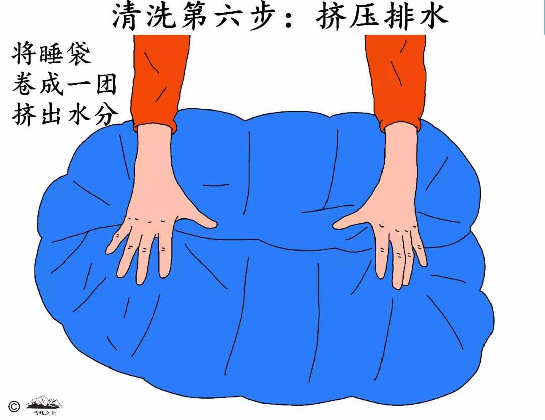 洗干净后,将睡袋卷成一团后挤出水分。采用挤而不是“拧”的手法。卷成一团的好处是避免拉紧和撕裂睡袋表面的接缝。