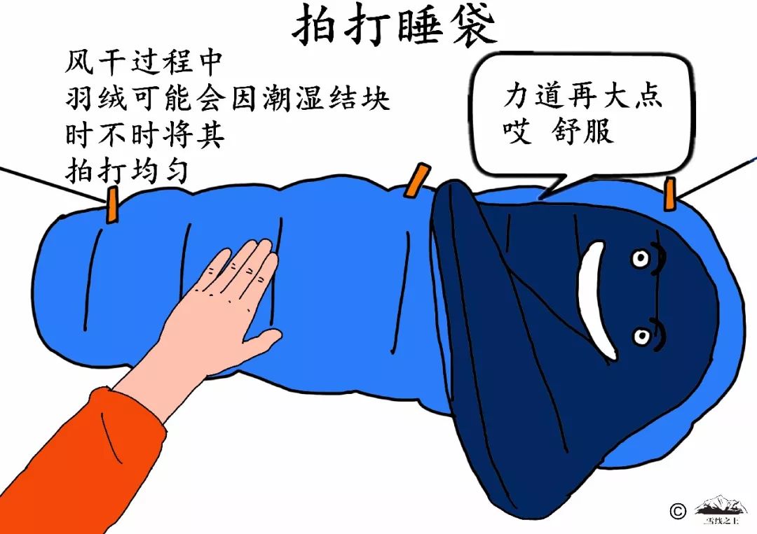 在风干的过程中,睡袋中的羽绒可能会因为潮湿结块,时不时地拍打,把挤成一团的羽绒拍打均匀。
