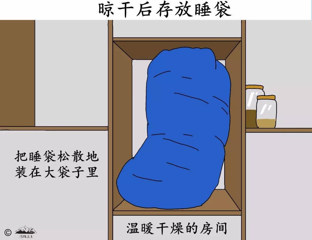 存放睡袋前要确保其干燥。(来源:《背包客手册》,[美] 克里斯·唐德森著)