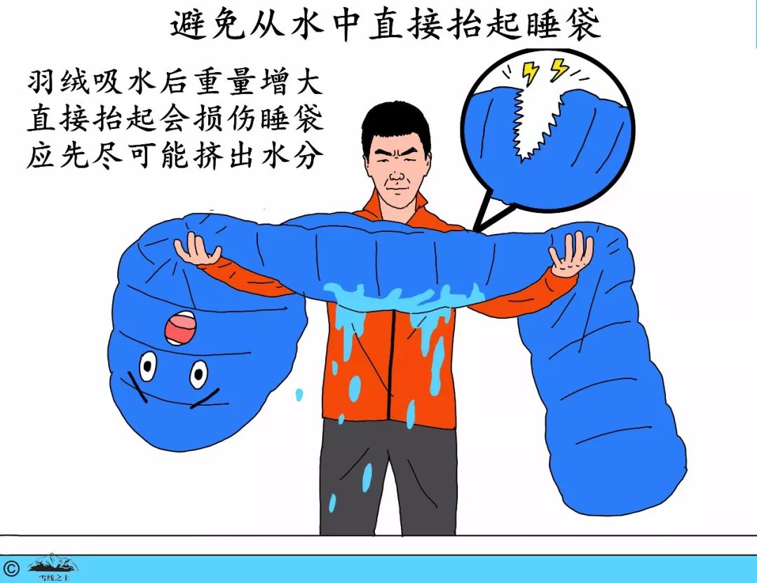 在冲洗时换水时,不要用力抬起睡袋。因为羽绒吸水后重量增大,用力抬起时会损伤睡袋。