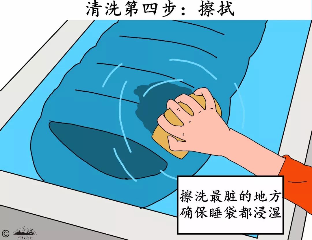 针对织物表面,可以用一块海绵擦拭。针对羽绒的清洗,可以用手从一端到另一端揉搓睡袋。如果你在浴缸中清洗,也可以用脚反复踩。擦洗的过程可以反复。