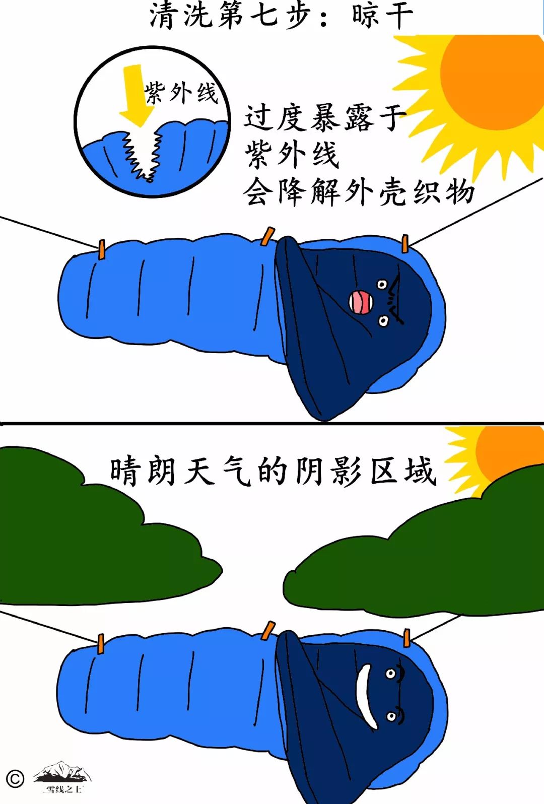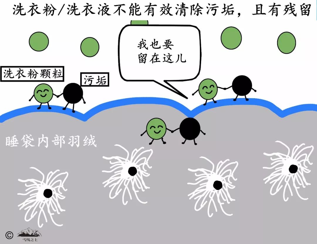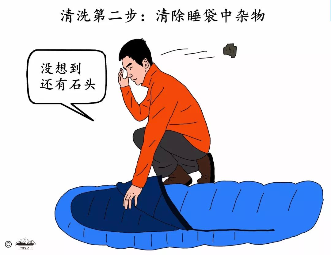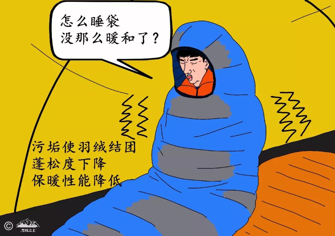 普通清洗剂会去除羽绒上的天然油分而缩短其寿命。不建议干洗睡袋,因为溶剂可以溶解羽绒的天然油分。(来源:《背包客手册》,[美] 克里斯·唐德森著)