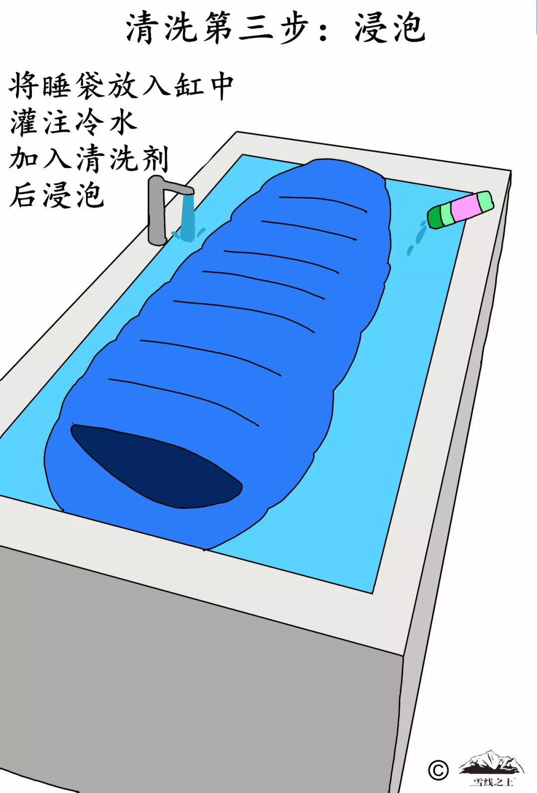 选择浴缸或是一个大盆,用冷水灌注后放入睡袋,再加入适量的清洗剂浸泡。