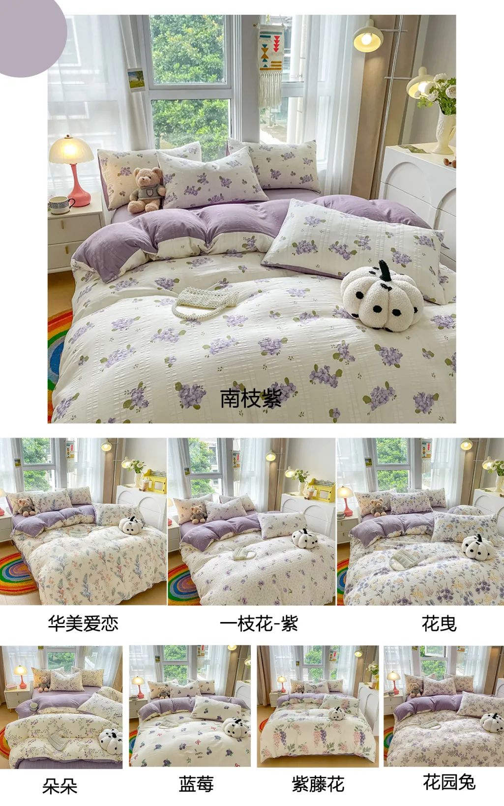 浪漫紫,有8款花型:淡淡的紫色轻松打造出梦幻般的浪漫,躺在上面,徜徉甜美梦境。