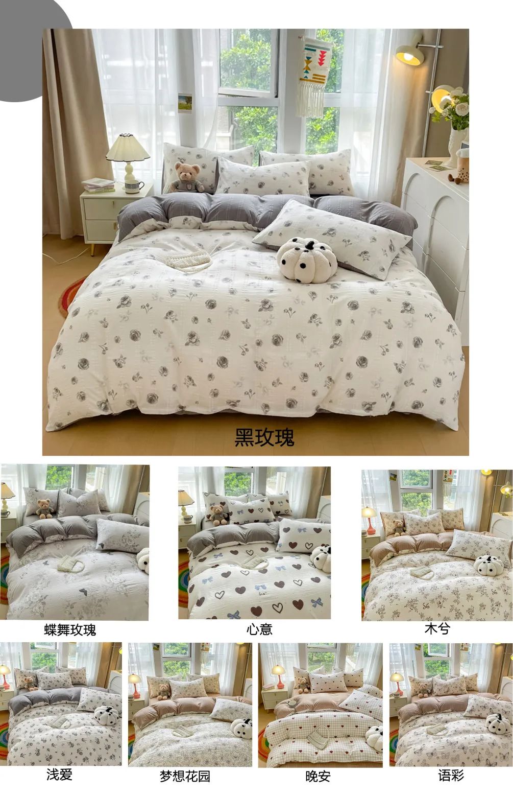 有3件套和标准4件套、加大4件套的规格,1.2米、1.5米、1.8米、2米的床都有的挑!