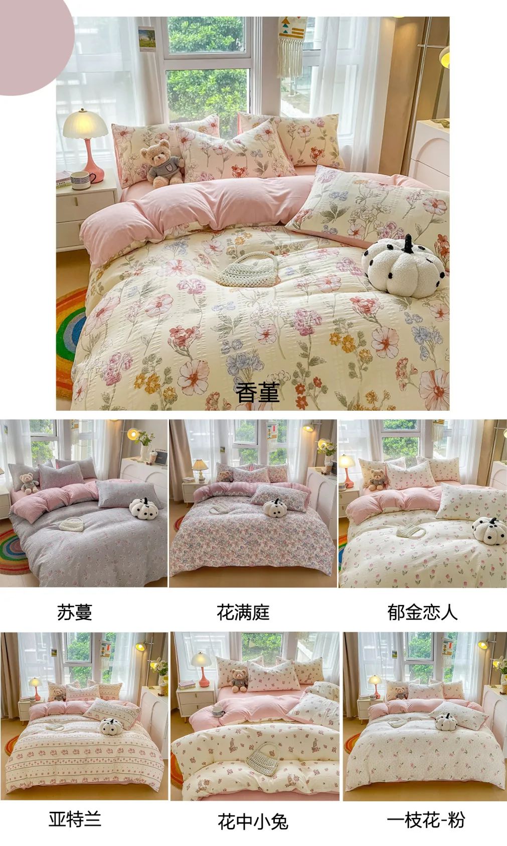 整体清新田园风,有7种色系,36款花型。灰色、咖色、紫色、粉色、橘色、绿色、蓝色,可以根据自己的喜好选择。
