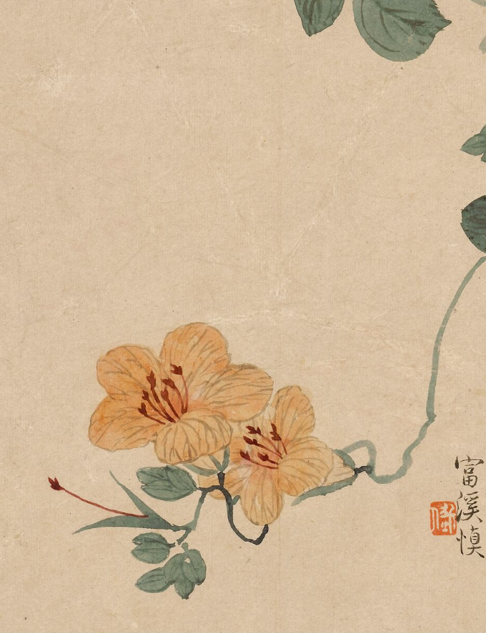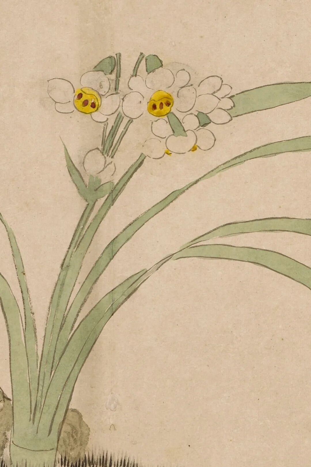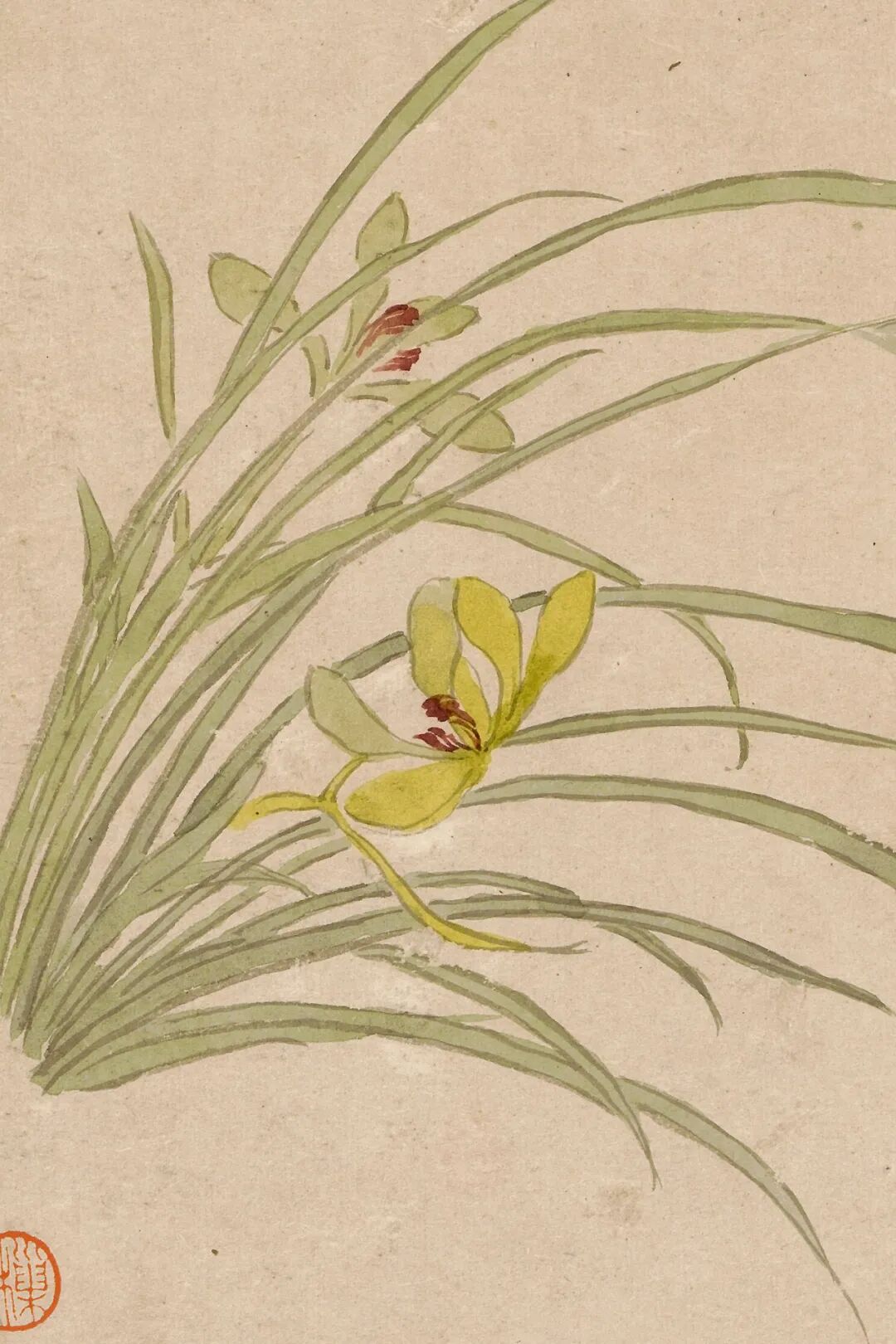 或双钩填色,如水仙、蚕花、兰花双钩叶子轮廓后敷色,晕染十分细致,在写意中辅以工细之笔,韵味十足;