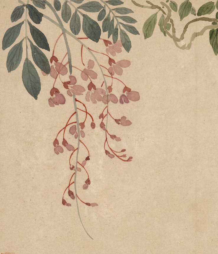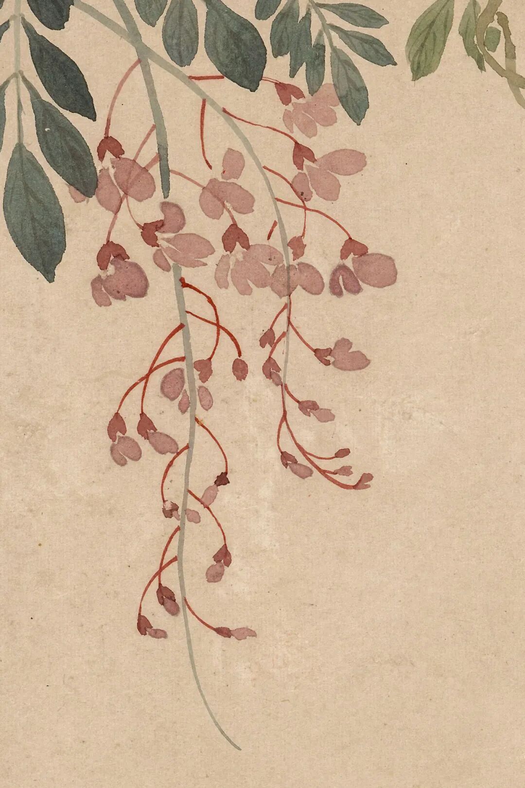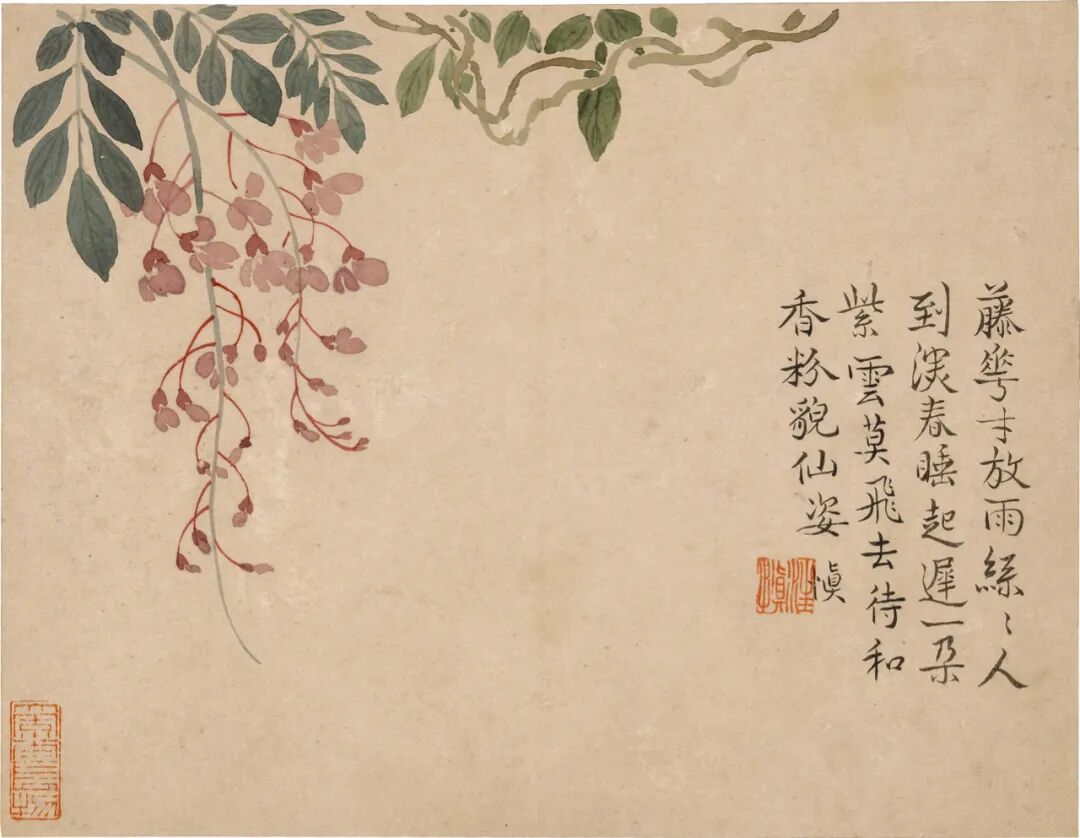 题识:藤花才放雨丝丝,人到深春睡起迟。一朵紫云莫飞去,待和香粉貌仙姿。