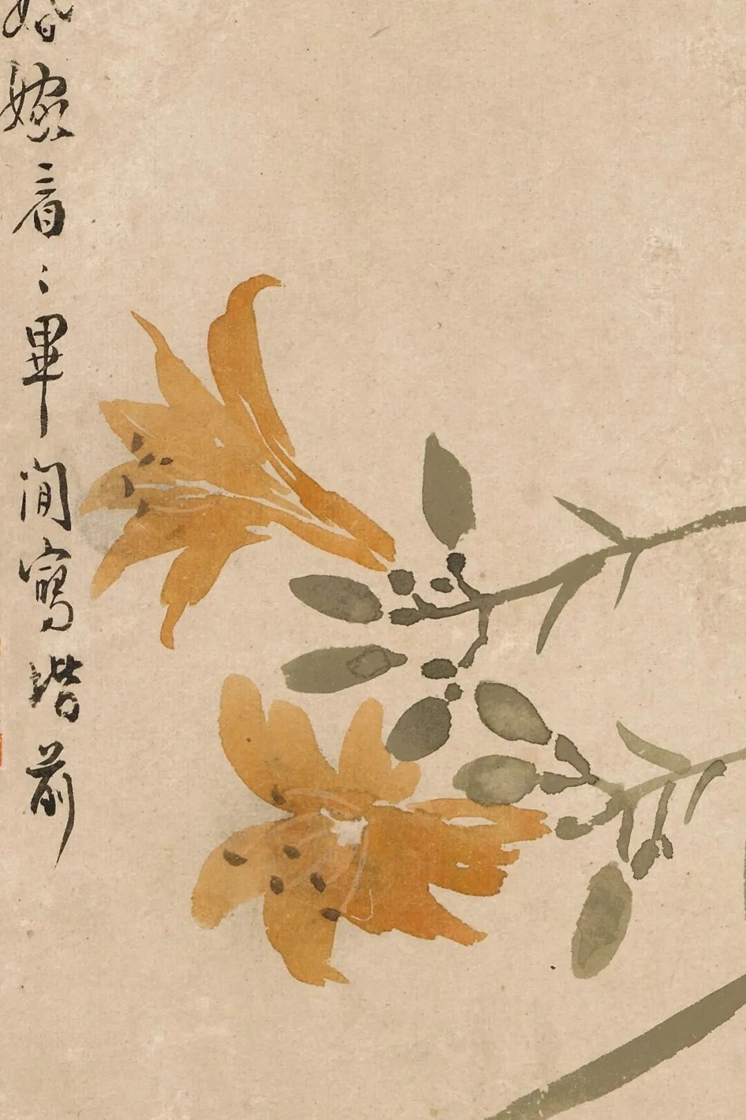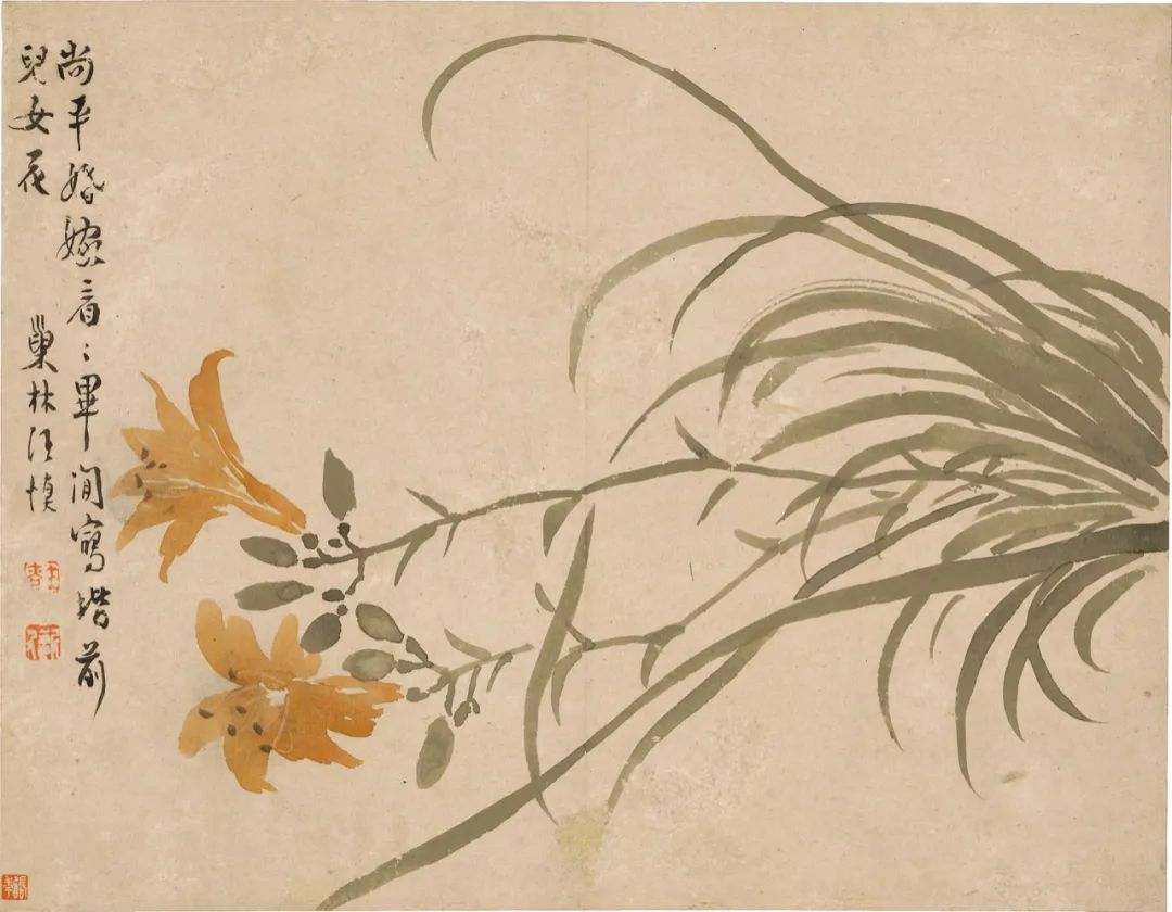 或书法挥写,如萱花,以行草疾笔撇出叶子,笔意潇洒,再如竹石,以隶书写出竹叶,古拙平淡。