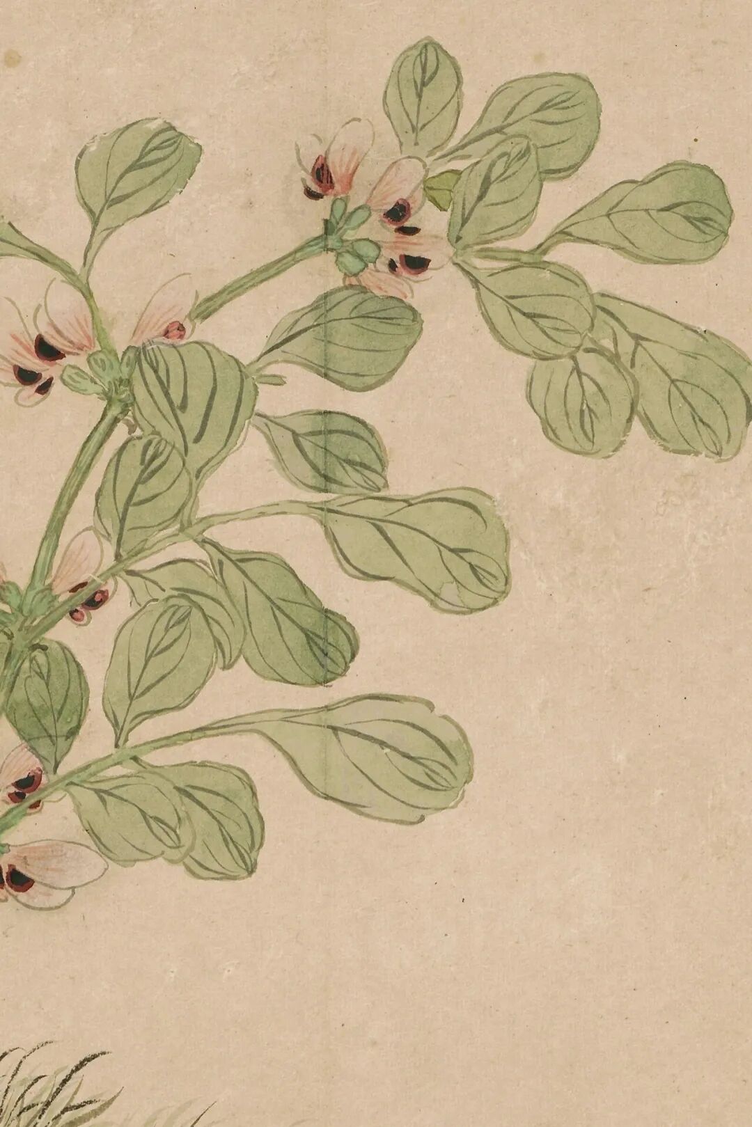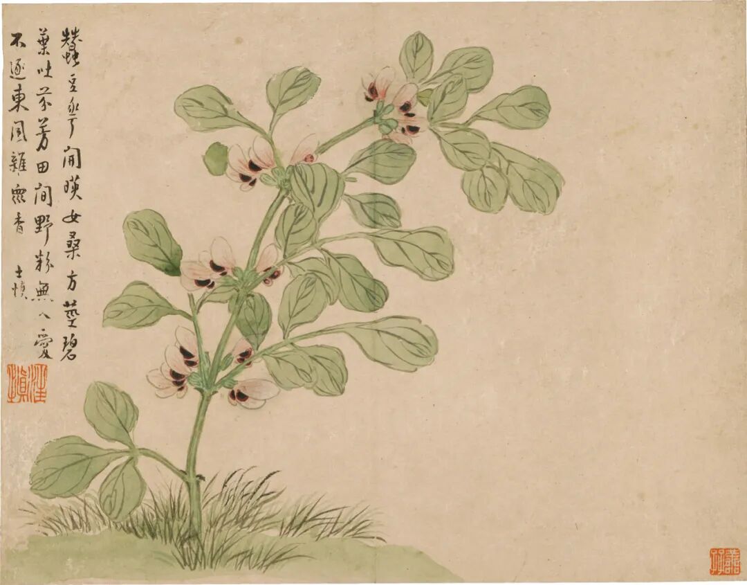 题识:蚕豆花开映女桑,方茎碧叶吐芬芳。田间野粉无人爱,不逐东风杂众香。