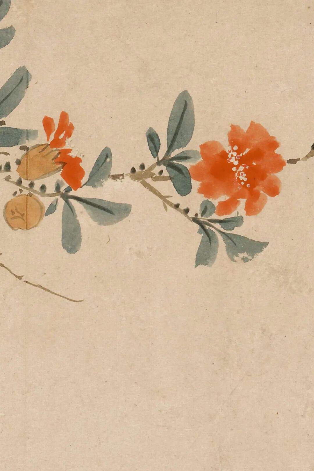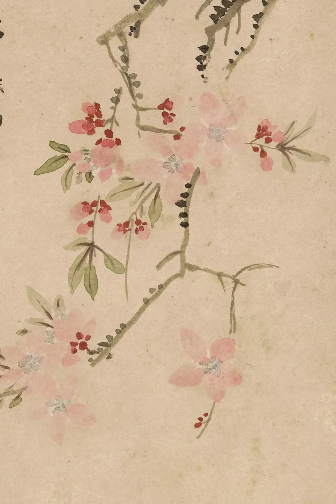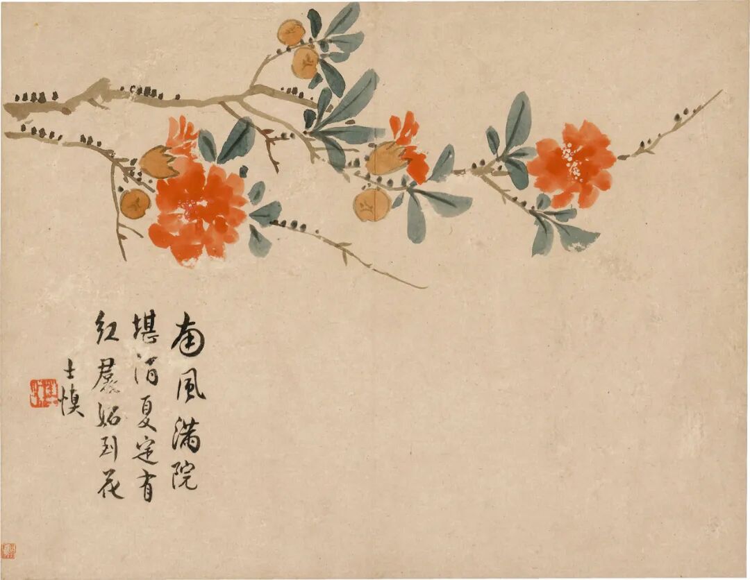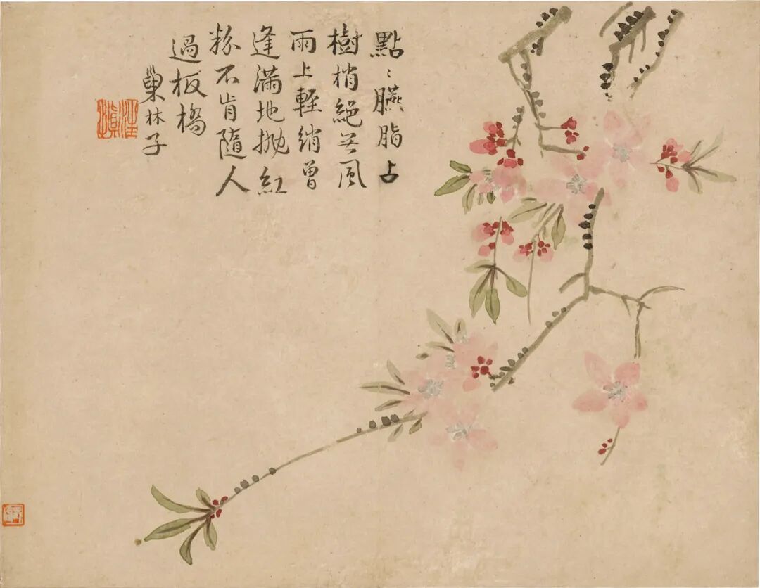 就技法而言,《花卉图》册纯以色画,技法多样而统一,或没骨点染,如樱花、梅花、石榴、桃花皆以中锋写出主干,后用浓墨略加苔点,叶子以湿笔画出后勾筋,以颜色的浓淡干湿显示其阴阳向背,花朵随意点染但颇合法度;